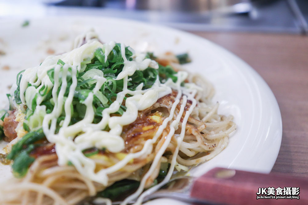 切了一塊下來放入口中,上層煎蛋香味與麵條的口感混合, 搭配洋蔥和高麗菜,口感非常好。