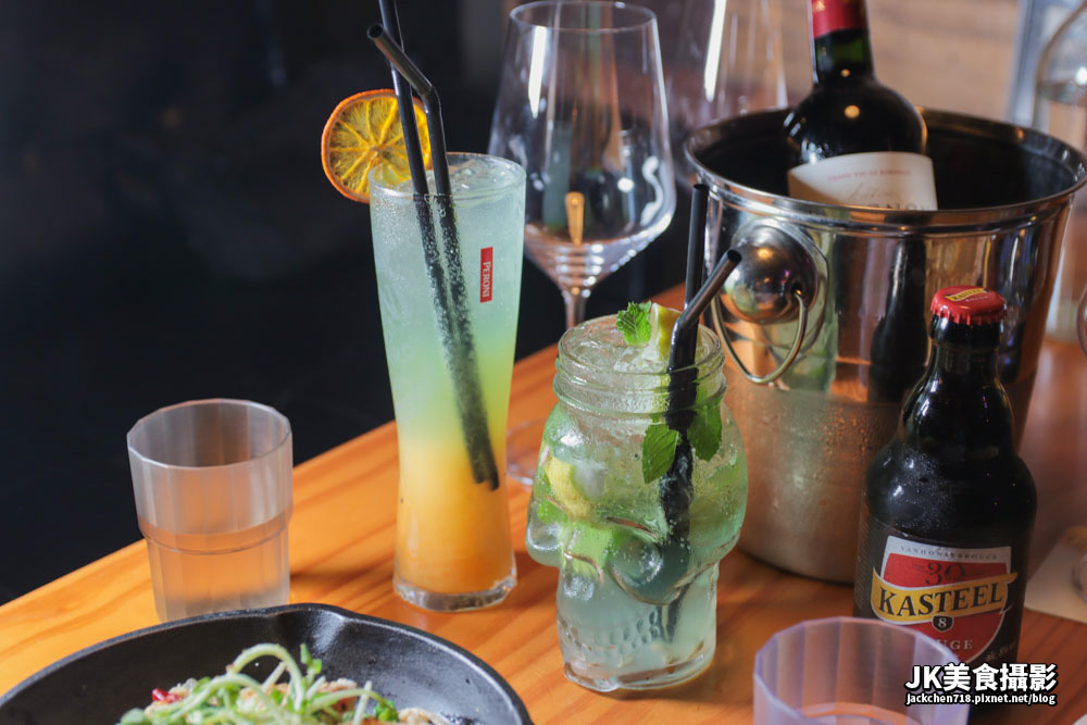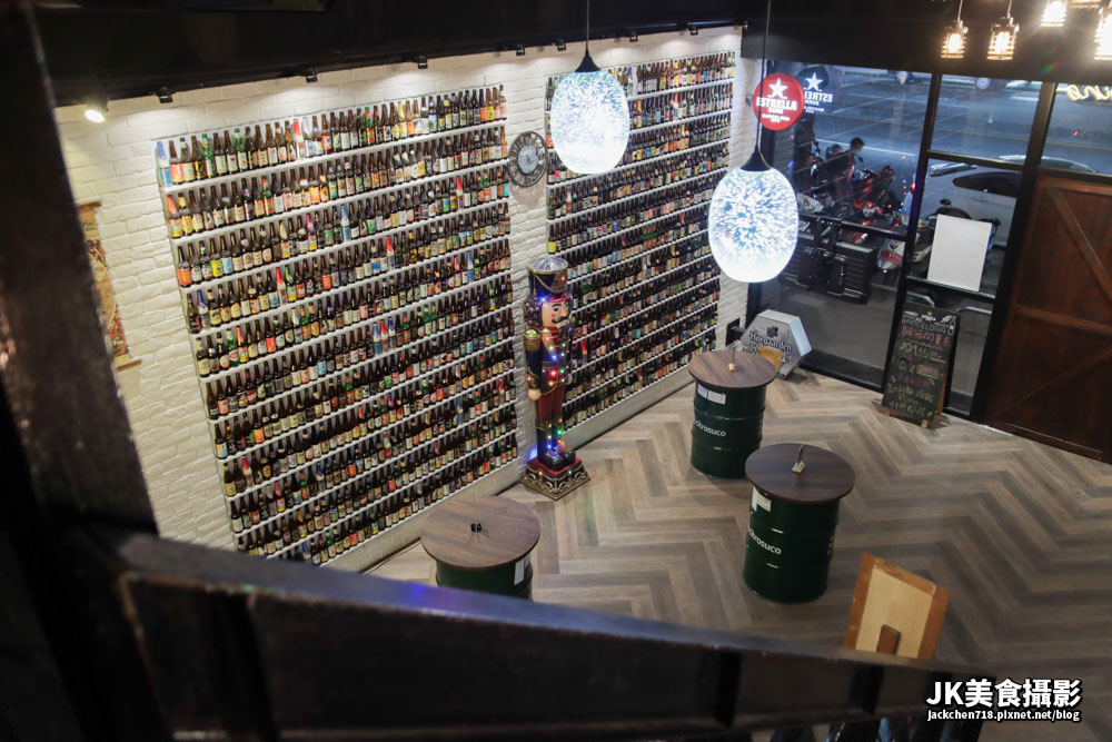 這邊是一間氛圍感非常強烈的餐酒館,從一樓走進去時,發現旁邊的牆面擺滿了玻璃瓶,正中間的LOGO非常顯眼,而店內擺了三個圓桌子卻沒有椅子