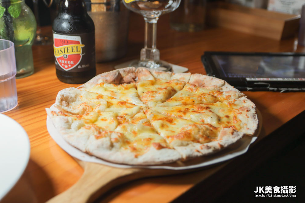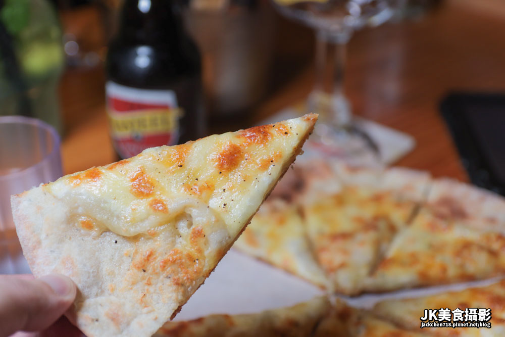 披薩的餅皮非常薄脆又口感,咀嚼後可以吃到餅香味,上層的起司交融在一起,形成強烈有層次的起司味,香氣非常濃郁。