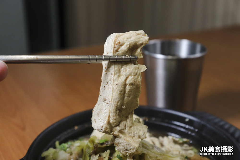 臭豆腐是非常大一塊的臭豆腐,切開的剖面與內部的空洞吸飽了了湯汁,整個豆腐麻辣可口。