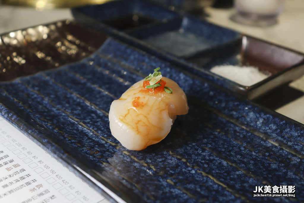 而干貝壽司的部分是生食級干貝,干貝新鮮好吃,上面放了鮭魚卵與青蔥增添味道,引出鮮甜味。