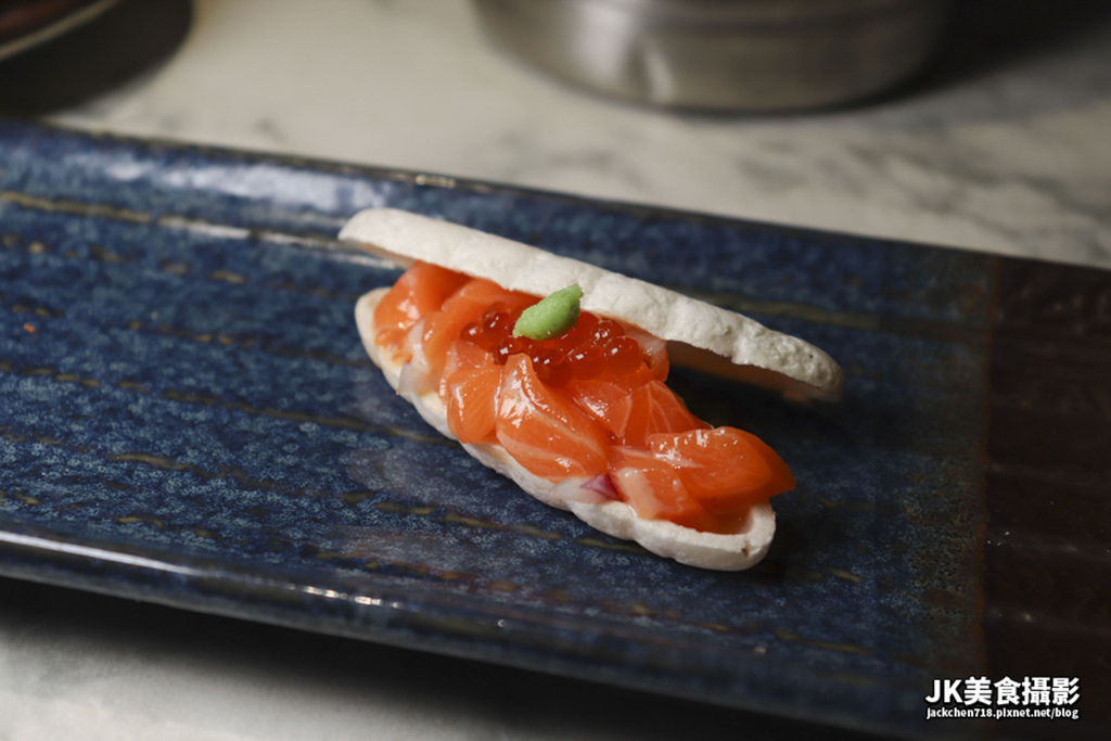 落葉歸根最讓人驚喜,是以滿滿的鮭魚生魚片放入葉子型的餅乾中,包裹起來一口吃下,鮭魚的鮮甜味道在口中蔓延開來,是頂級的享受。