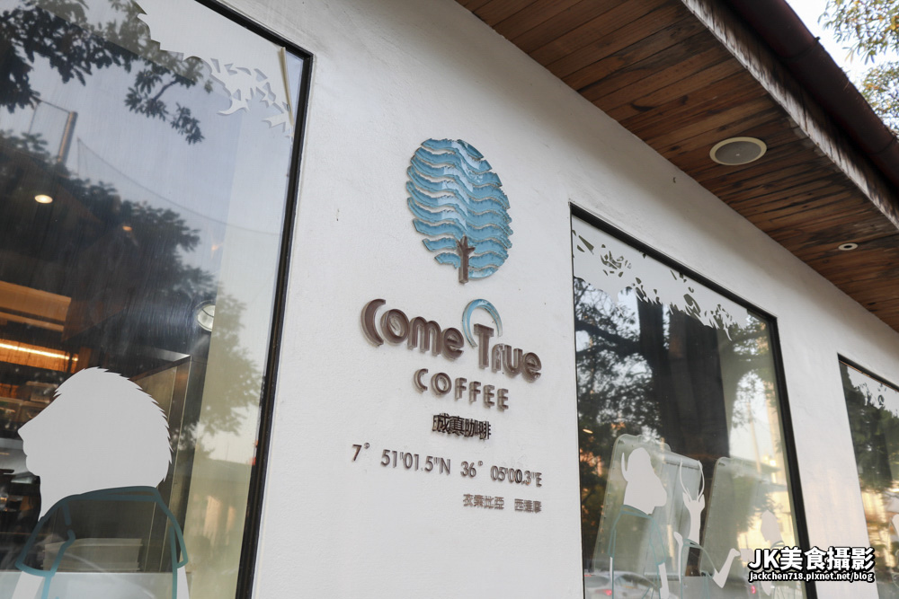 位於台中審計新村的成真咖啡,由兩間白色的樓房相對而立,房間上有大片的落地窗,外圍以木質地板組出台階與平台,兩樓房間放了數張桌子,有著一顆大樹,給人非常悠閒的感覺。
