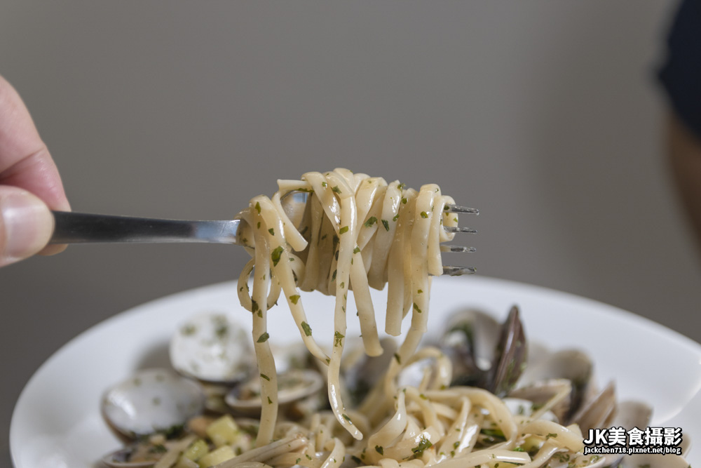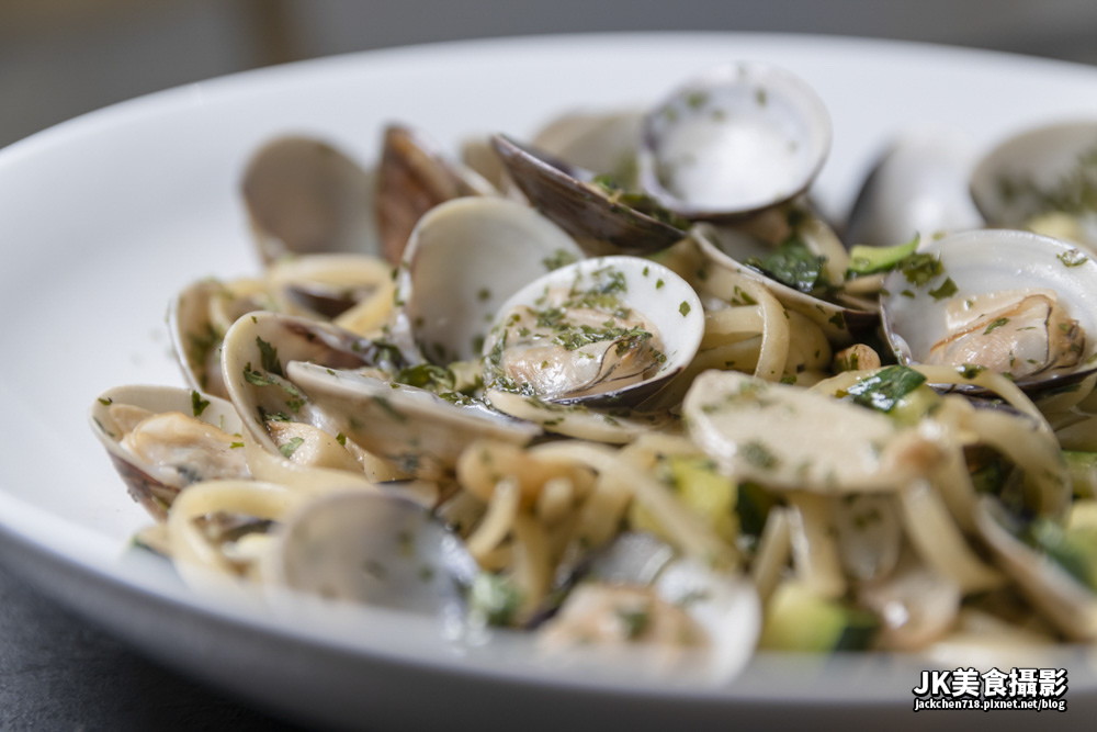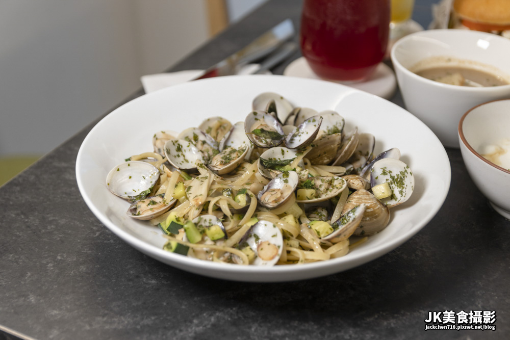 蛤蠣飽滿Q彈,入口鮮甜咀嚼後香氣四溢,份量驚人都快超過麵量,將麵條、蛤蠣、櫛瓜丁與蒜頭搭配一起入口,交織出美味的風味,令人滿足。
