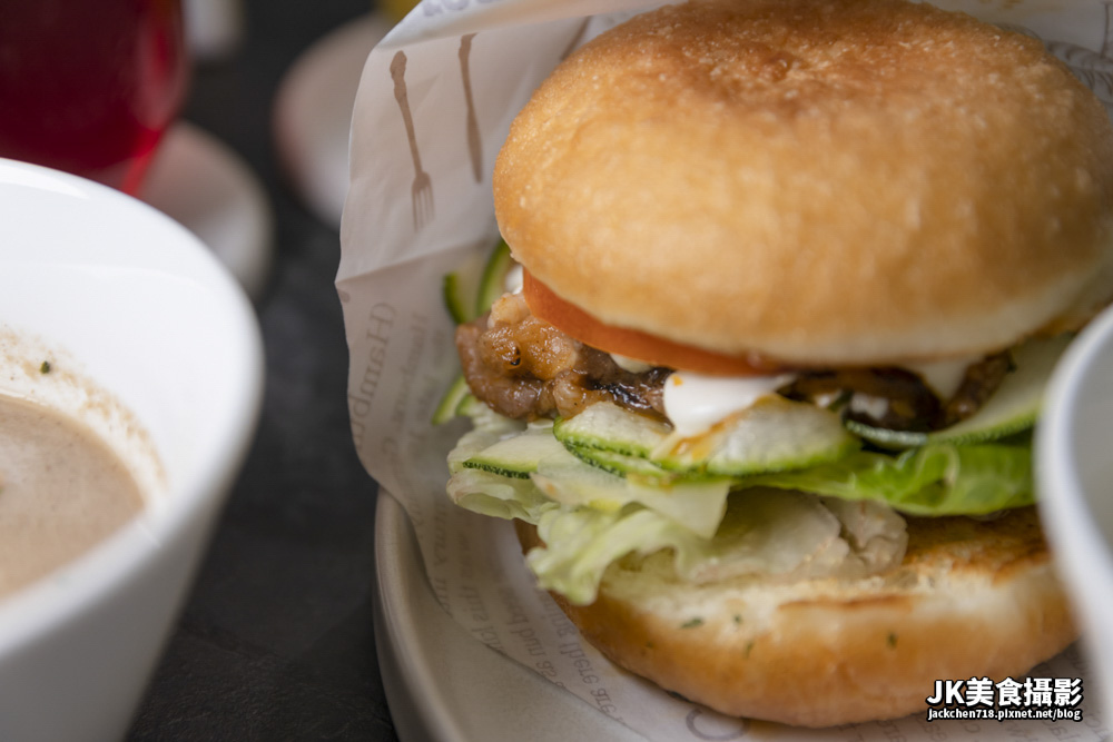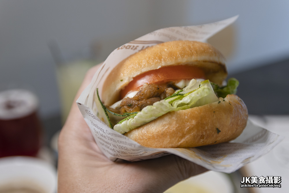 外層是用甜甜圈麵體的麵包,表層炸過,內裡有番茄後切片以及大量生菜,醬燒培根牛肉的味道鮮明。