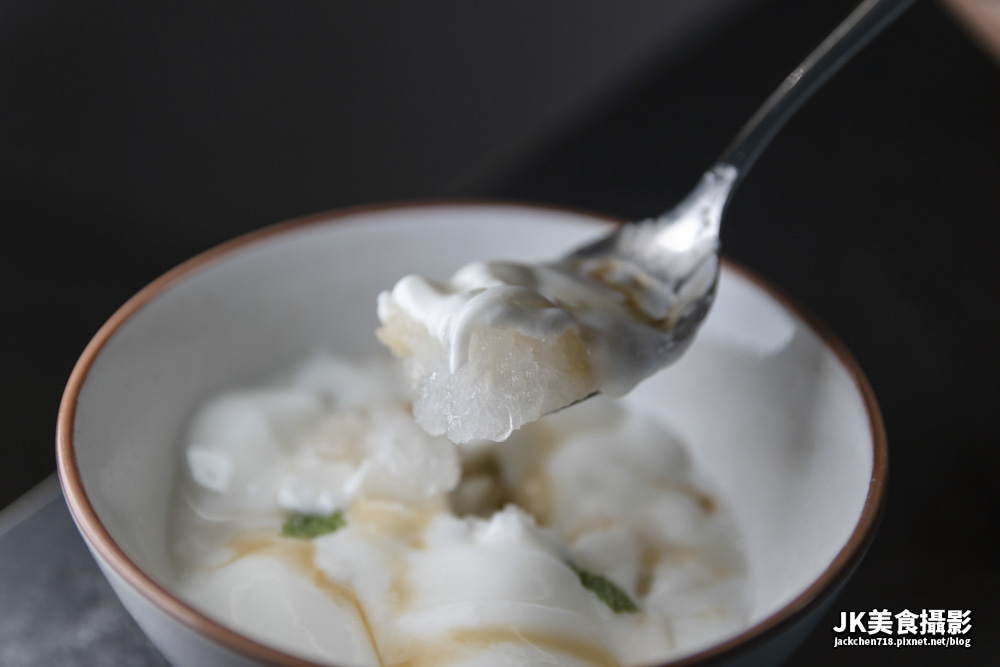 薄荷葉下面是白色乳花,上面淋上黑糖漿,下層是香蕉冰沙,整體搭配清涼中帶有熟悉的香氣風味,極香。