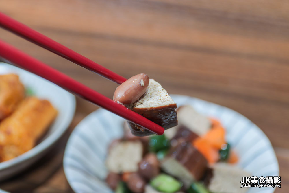 豆干香氣鮮明,是比較透氣綿細的黑豆干,搭配飽滿的花生和脆口小黃瓜丁,在口中散發多層次的風味與口感。