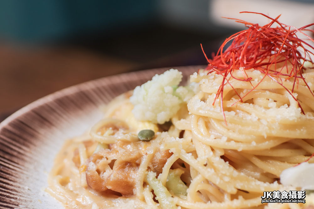 非常特別,有著鮮明的鹹蛋黃味道,放入口中嚼嚼,可以吃到濃郁的鹹蛋黃顆粒包裹在Q彈的義大利麵外面,味道非常豐富。