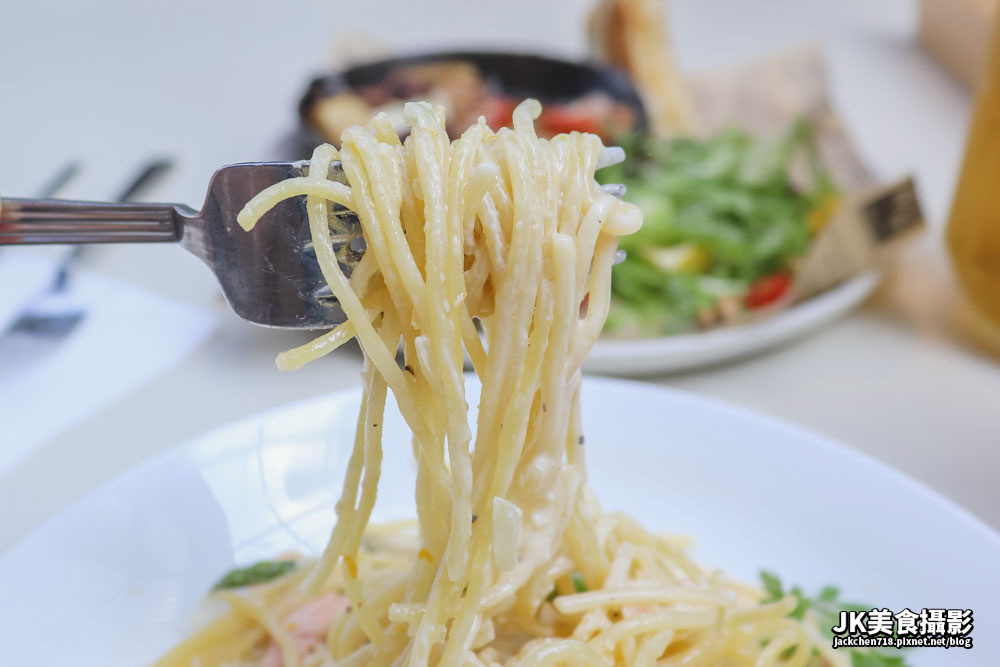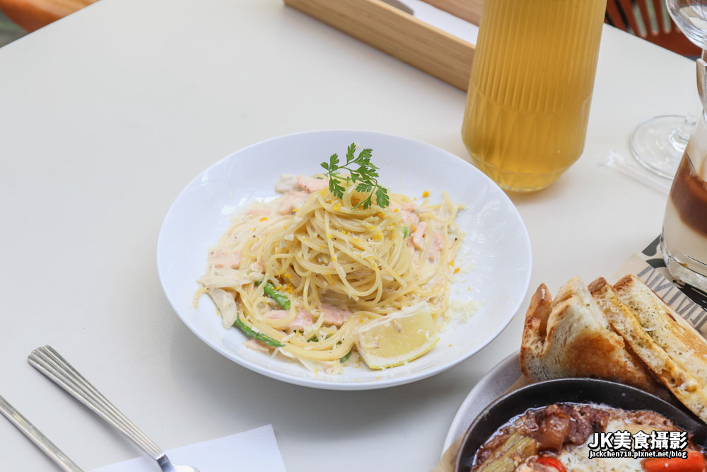 義大利麵體非常Q彈好吃,奶油香味與口感非常鮮明,煙燻鮭魚片味道頗強烈,搭配嫩蘆筍與薄切杏鮑菇片,整體味道豐富美味。