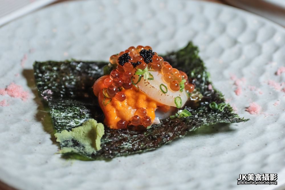 干貝非常濃郁鮮甜,海膽帶有鮮明的海鮮味,是清新爽朗的味道,搭配海苔捲起來,咀嚼後海苔香氣四溢,整體非常融洽,讓人覺得是頂級的海味享受。