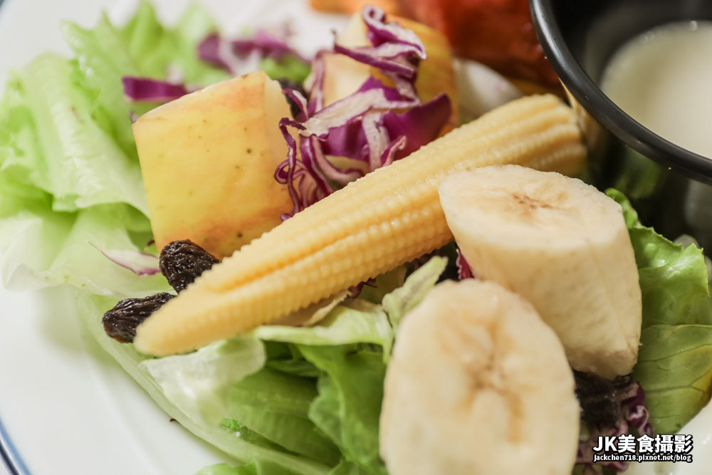 沙拉有蘋果、香蕉、玉米筍和美生菜以及葡萄乾,口感清脆好吃,搭配沙拉醬,增添酸甜濃郁的口感,讓整體味道更加豐富。