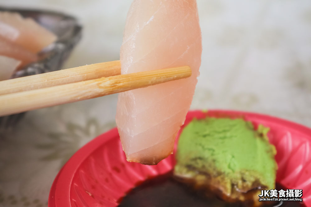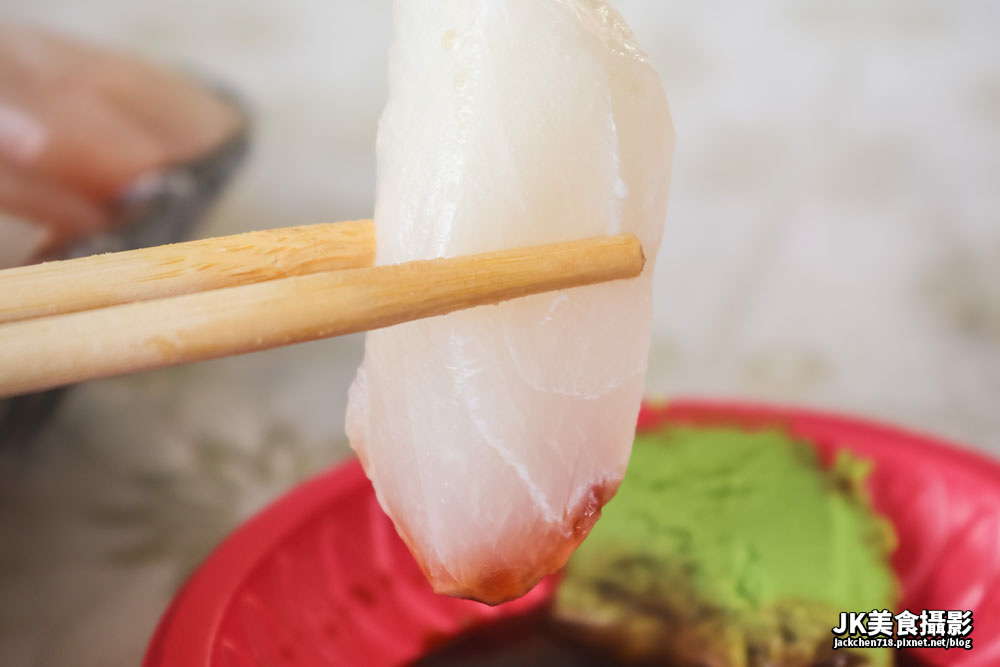 海鱺魚肉非常新鮮,菱角分明,放入口中口感爽脆好吃,沾上芥茉與醬油,鮮甜滋味鮮明,口感有點像蒟蒻,非常好吃。