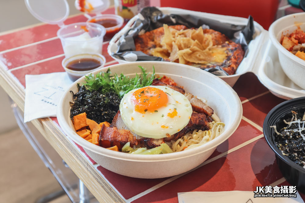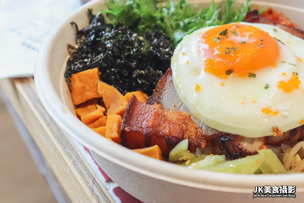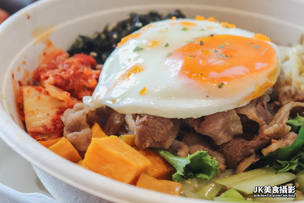 有豆芽菜、美生菜、地瓜、韓式泡菜、韓式海苔、賀喜菇,沙拉味道非常豐富,搭配沙拉醬,整體層次感十足。